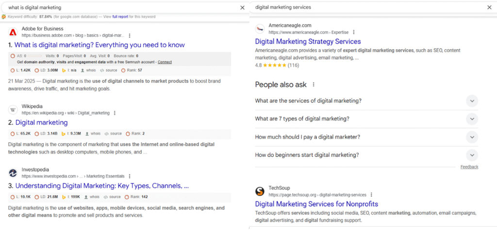 The search intent for the keywords ‘what is digital marketing’ and ‘digital marketing services’ differs. The first has an information search intent, whereas the second has the navigation/transactional search intent. Writing the content to meet the search intent can push your website up in the page, and it is a positive sign for Google.